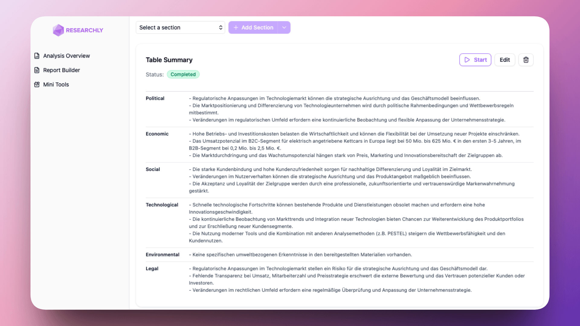 - Schritt 3: KI-Agent arbeiten lassen: Researchly recherchiert automatisch Customer Jobs, Pains und Gains Ihrer Zielgruppe und erstellt ein vollständiges Canvas Researchly Company Profile.txt.