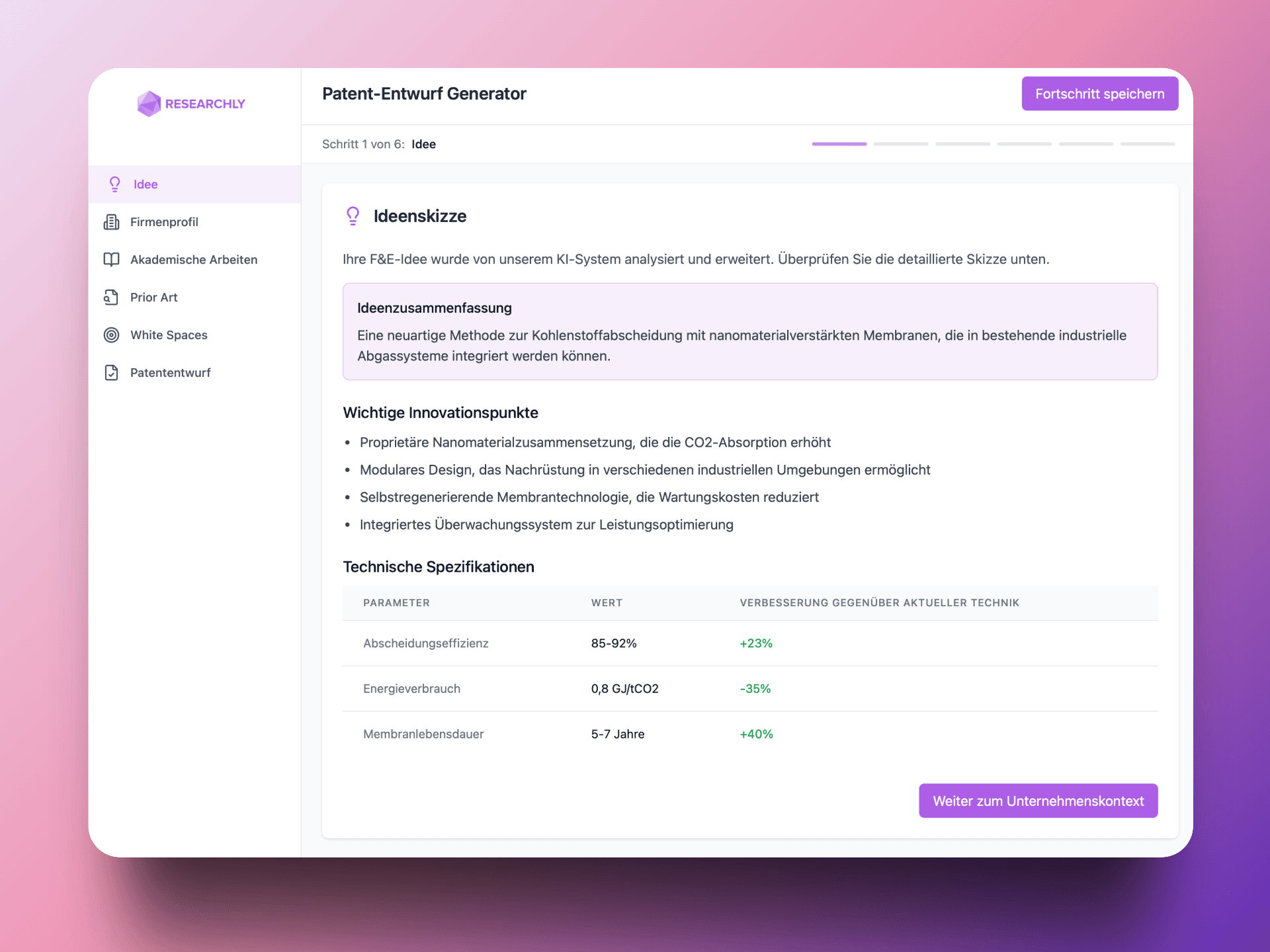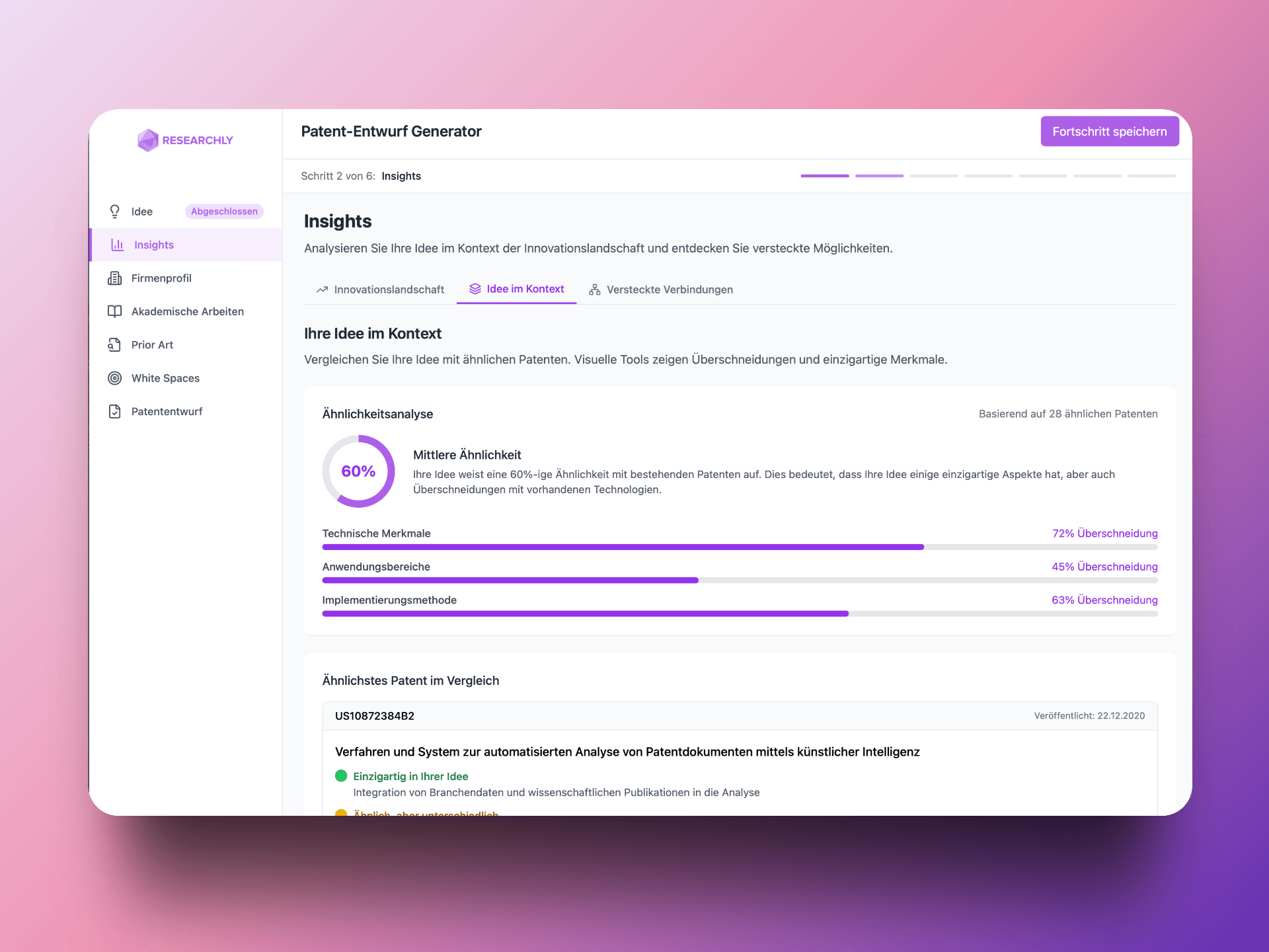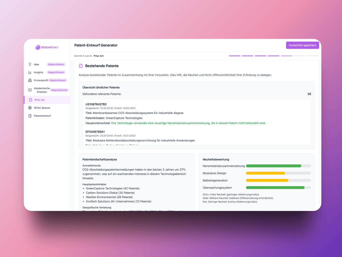 Researchly analysiert mit Natural Language Processing (NLP) und maschinellem Lernen relevante Patente, wissenschaftliche Publikationen, Branchendaten sowie den Stand der Technik (Prior Art), um Innovationspotenziale rund um Ihre Idee zu erkennen