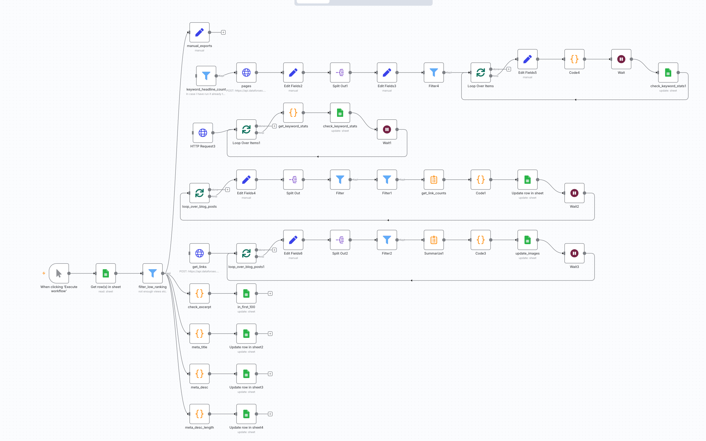 - Google Sheets doesn’t like it when you query it too much, thus the wait node to avoid request timeouts