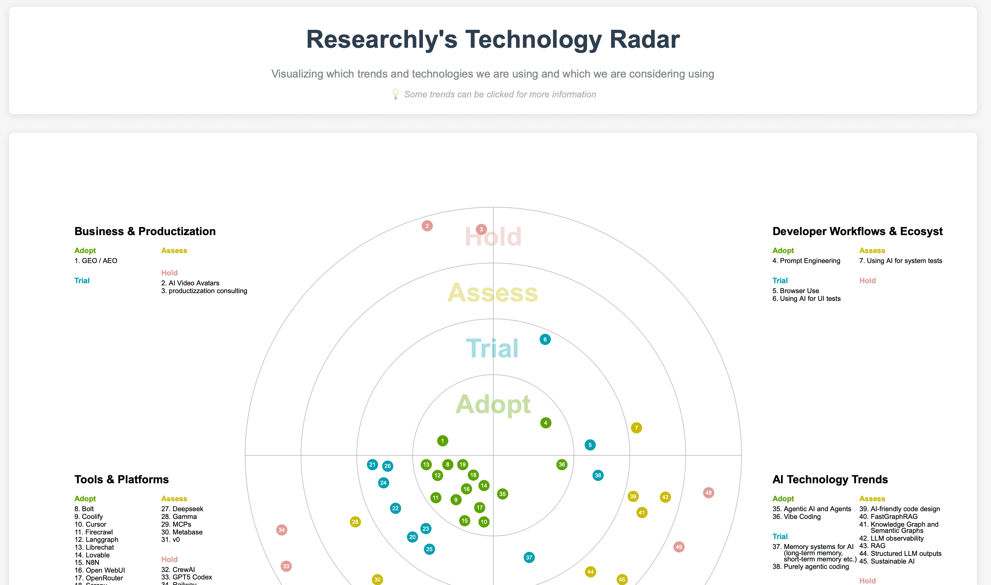 A “technology radar” is a strategic tool to help you systematically monitor and assess emerging trends. While it’s traditionally thought of as something only big companies do (see inspiration section), we’ve found it’s just as valuable for startups, especially in fast-moving fields like AI.