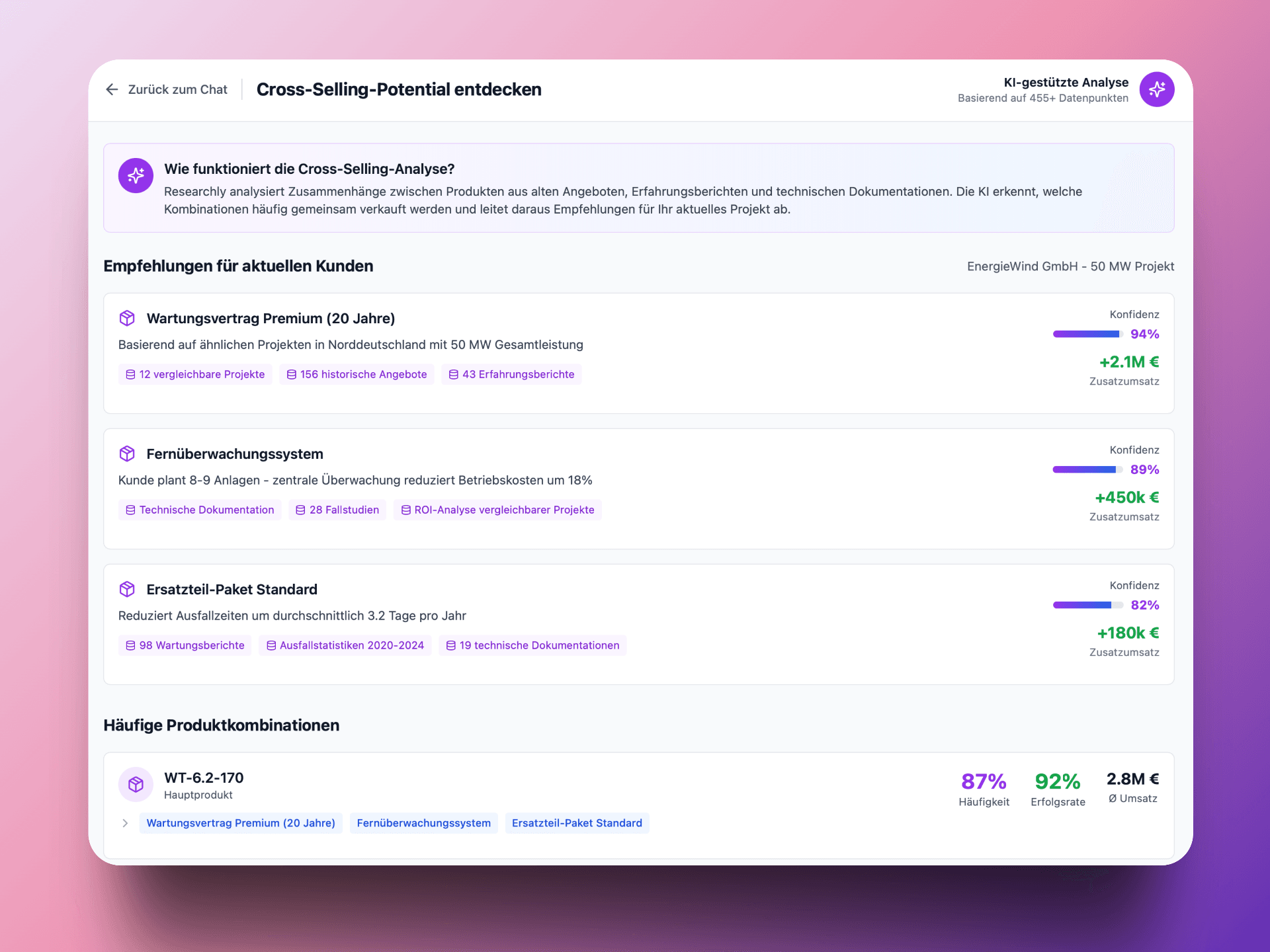 Researchly versteht Zusammenhänge zwischen Produkten und erkennt, welche Produkte oder Dienstleistungen üblicherweise gemeinsam eingesetzt werden. So kann die KI beispielsweise aus alten Angeboten, Erfahrungsberichten oder technischen Dokumentationen ableiten, welche Kombinationen häufig verkauft werden.